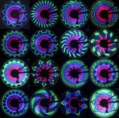 I wish they came in sizes as my tyre are bigger than the gizmo. And I wish I could see it. but all the fun is happening out of my eye sight and its just as well. I would probably get memorized and crash. What I can tell you is that it stops people as I ride by in the dark and they honk, oooh, and comment in such ways that I know it must be as fun as it looks. I am a tall girl and I don't have any friends who can reach my peddles otherwise I would ask. Some day I might find a tall stranger to ride it for me and then my review will change to one star owing to the lights causing the theft of my bike. Until then, I am getting another for the other wheel and telling you that you WILL be noticed by this thing. At least from the side.