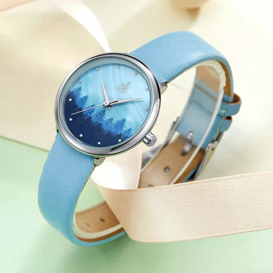 My main watch needed to go in for an overhaul, so I needed a watch to wear for a few weeks. This one is so nice that I am putting off my old watch for service! It’s so pretty and easy to wear, and the face is easy to read! I love the sky blue face and baby blue band, neutral but not boring. The slim leather band is comfortable and doesn’t feel heavy or sweaty like wider bands can feel on me. Even my watch snob husband said he loves it on me! Be aware it does tick, if that kind of thing bothers you. So happy with this purchase