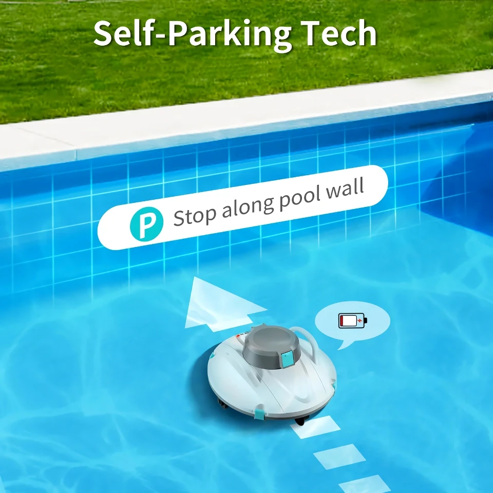 Our Cordless Robotic Pool Cleaner is not just a pool cleaning tool, it’s a complete pool maintenance solution. With its powerful suction and dual-drive motor, it ensures thorough cleaning by effectively removing debris, leaves, and small stones. The large battery capacity ensures extended cleaning sessions, covering up to 1200 ft² of pool area, making it ideal for larger pools. Additionally, its fast charging capability means less downtime and more cleaning. Plus, the self-parking feature adds convenience, making it easy to lift out of the pool when the battery is low.