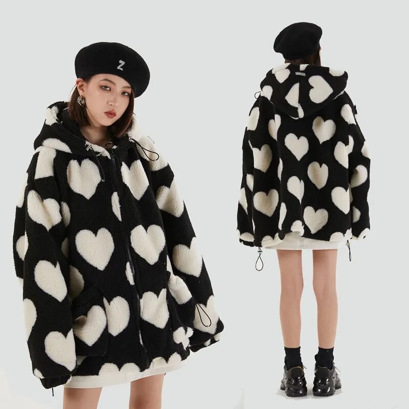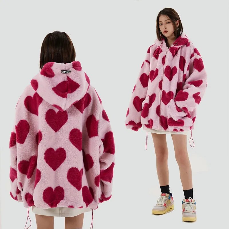 Don’t let the spring chill dampen your style. Add the Harajuku Heart Print Plush Hooded Jacket to your wardrobe and enjoy the perfect mix of warmth, comfort, and fashion. Shop now to make a statement this season!