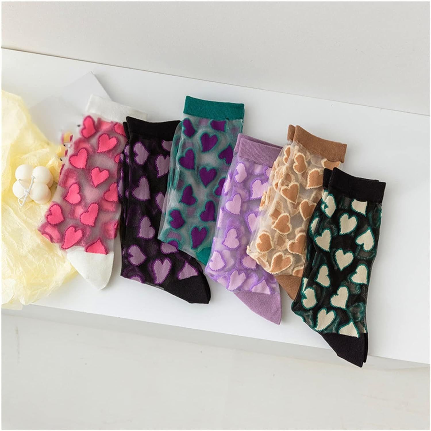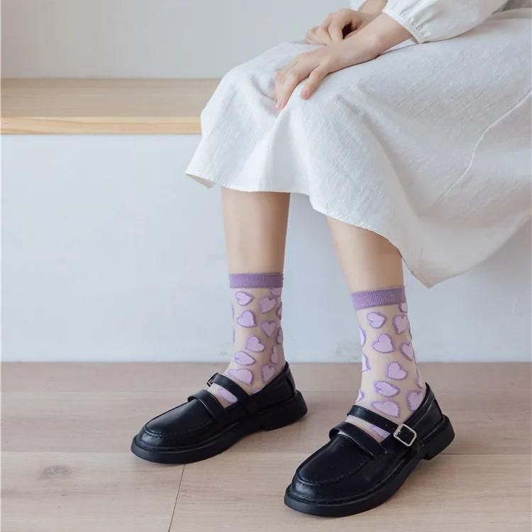 Featuring a delicate heart print design, these socks are perfect for adding a subtle yet charming accent to your outfit. The ultra-thin and transparent fabric make them ideal for warm summer days, providing breathability and comfort without compromising on style.