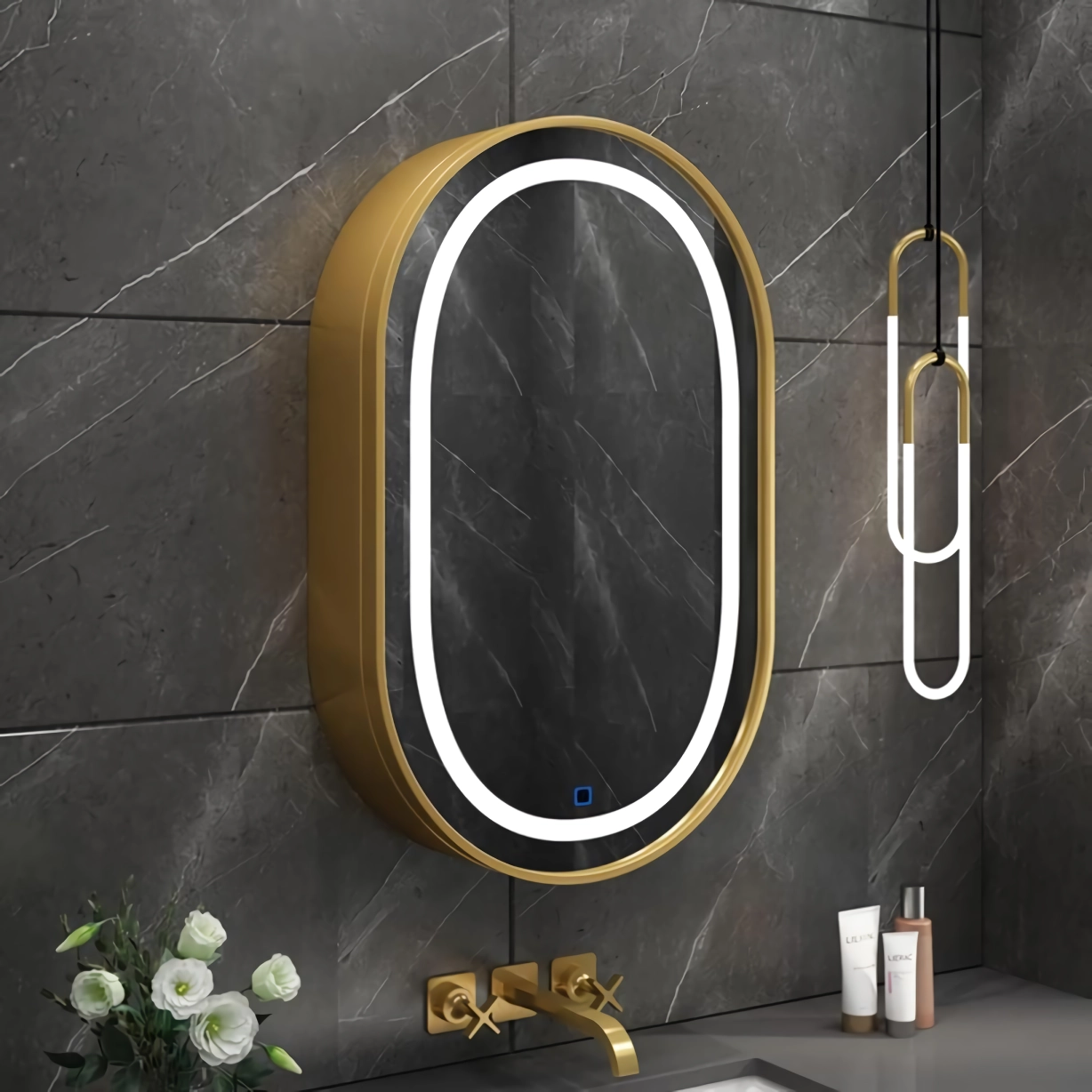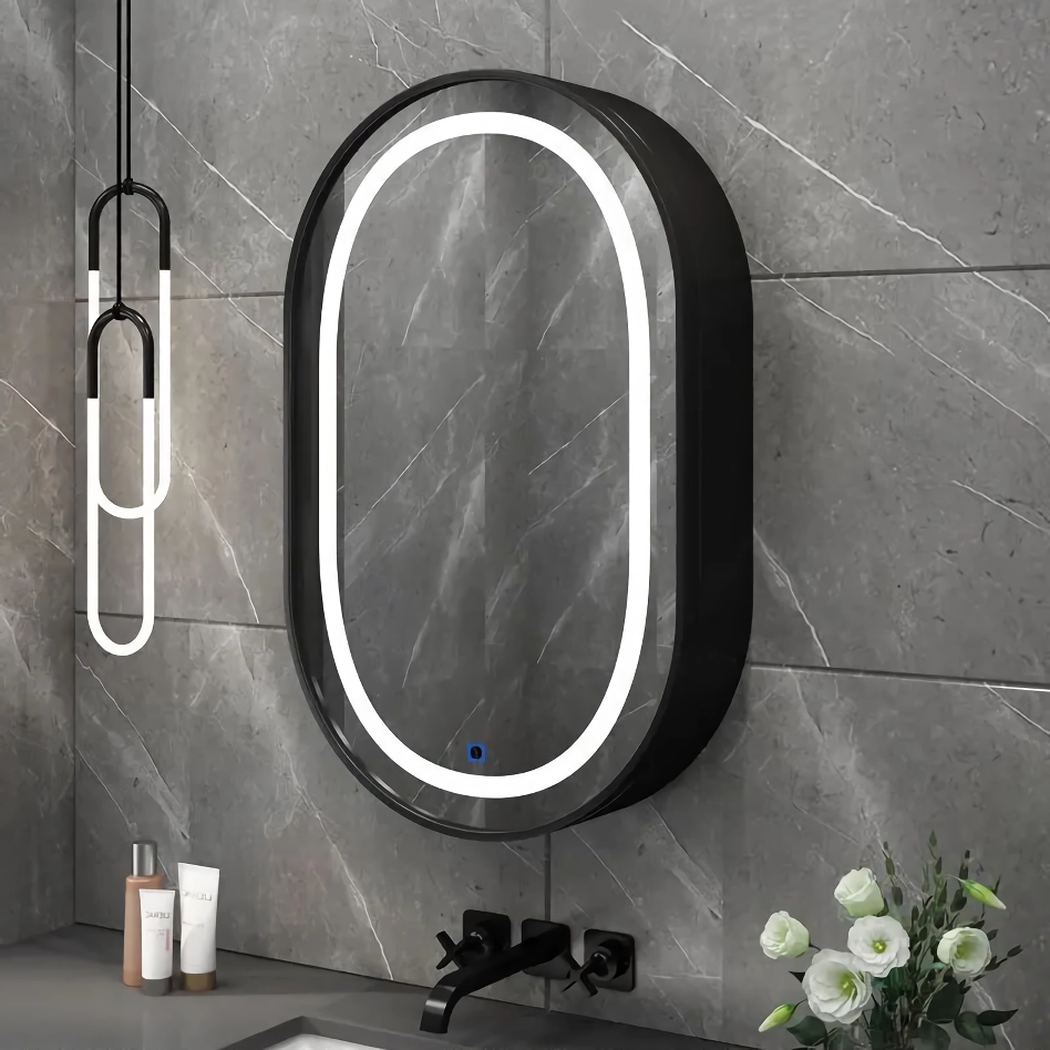 Our mirror cabinet is designed with your needs in mind. It features a solid wood frame, bringing a natural and warm feel to your bathroom. The oval shape and illuminated LED light create an inviting and soothing environment. Its 6-inch size is perfect for bathrooms of any size, offering ample storage without overwhelming the space. The EU standard 110~220V, 2-pin round plug ensures compatibility and easy installation.