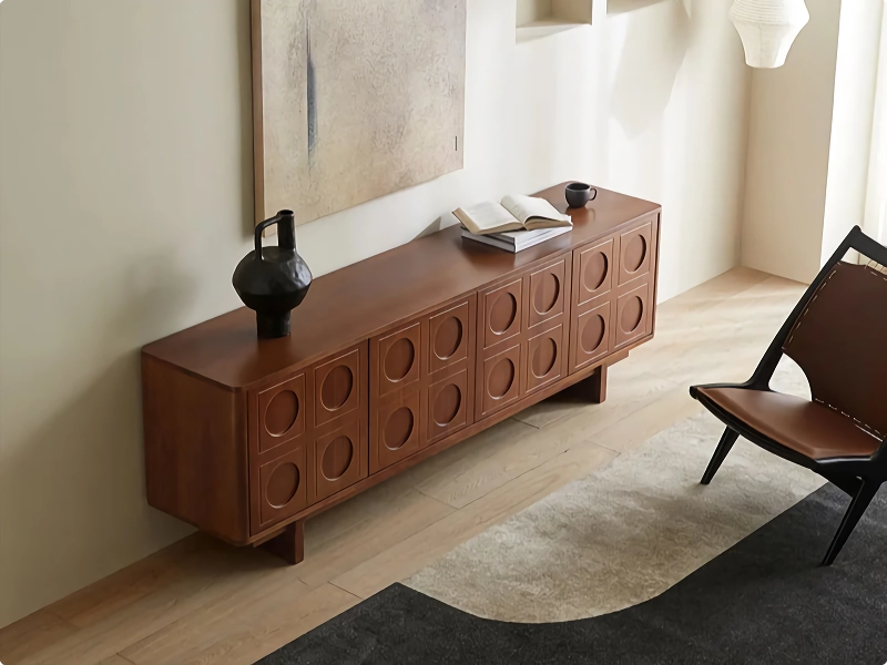 After searching for the perfect centerpiece for my entertainment area, I found this retro-inspired wooden console that instantly caught my eye. Its design pays a subtle nod to classic mid-century modern furniture, characterized by clean lines, functional form, and natural wood textures. This piece has not only met but exceeded my expectations in both style and utility. The quality of the wood is top-notch, giving it a sturdy and premium feel that I know will withstand the test of time. The design smartly accommodates modern technology, with enough space for a large screen, sound system, and other media devices. The mix of open and closed storage is ideal for displaying decorative pieces while hiding away cables and remotes, ensuring a neat and stylish setup. The attention to detail in the design, from the smooth-running drawers to the perfectly aligned doors, speaks volumes about the craftsmanship. Assembling the stand was a breeze, with all parts fitting together seamlessly and instructions that were easy to follow. It’s not just a functional item but a beautiful addition to my home that complements my decor and brings a sense of warmth and nostalgia. The stand’s dimensions are perfect, providing a spacious surface for my television without overpowering the room. Its practical design, combined with the charm of retro aesthetics, makes it a standout piece that has garnered many compliments from visitors. Overall, this wooden console is a fantastic find, offering both the look of timeless furniture and the functionality needed for today’s entertainment needs