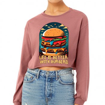 Burger Print Cropped Long Sleeve T-Shirt – Quote Women’s T-Shirt – Illustration Long Sleeve Tee